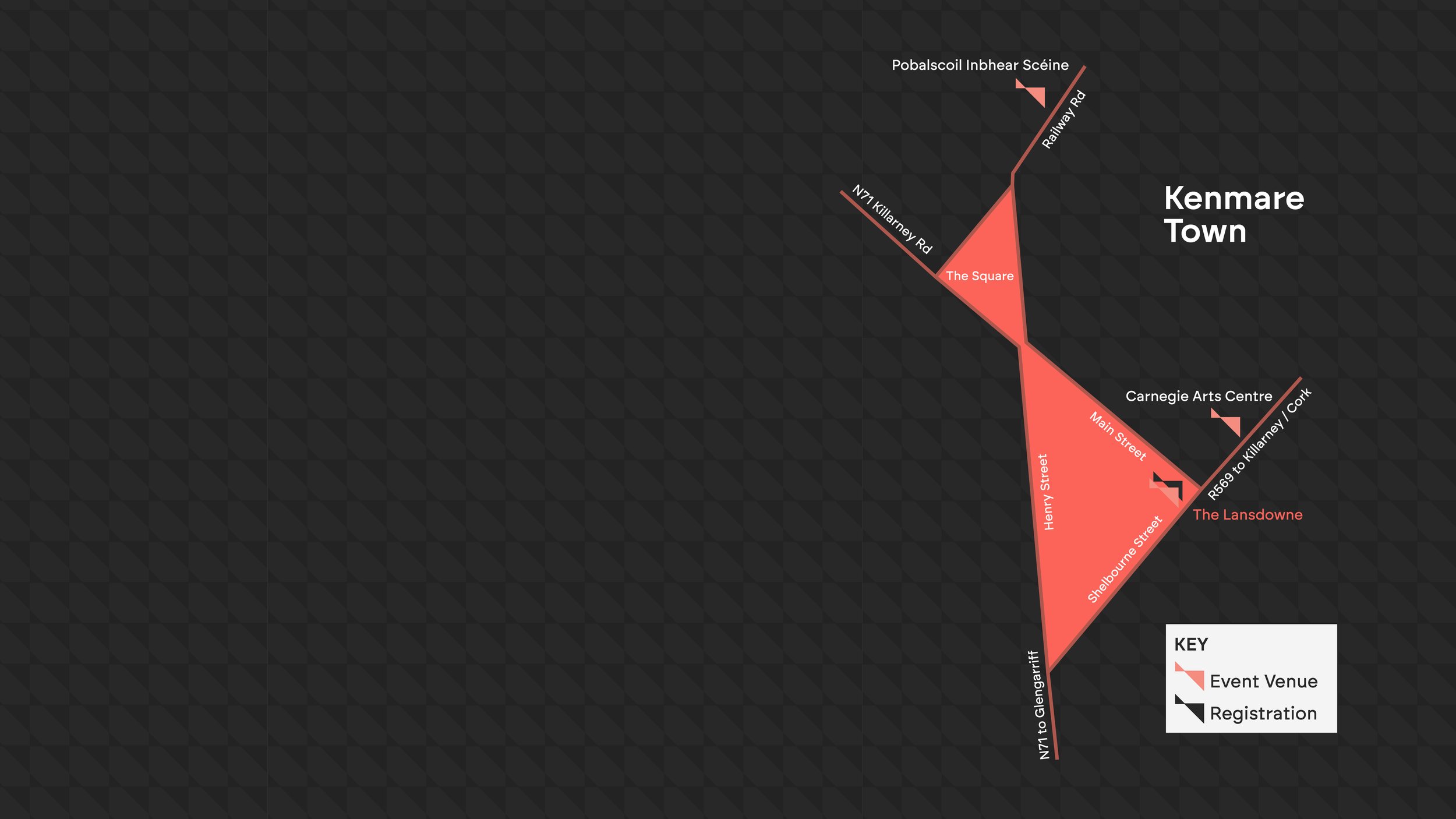 If you are unfamiliar with Kenmare please see our little map which indicates the location of our event venues. There is a large free parking carpark across the road from the Pobalscoil. There is a 2 hour parking limit around the streets.